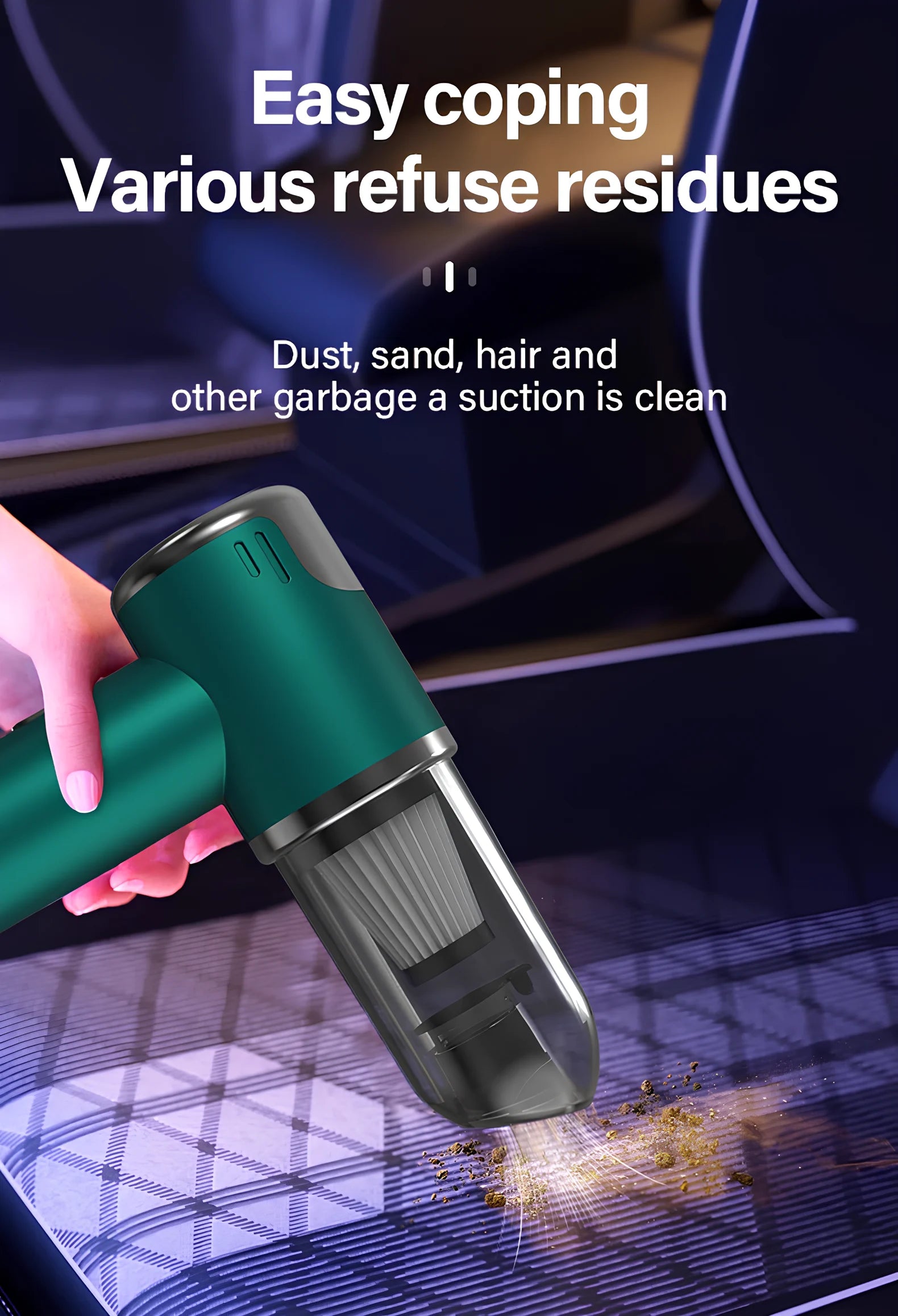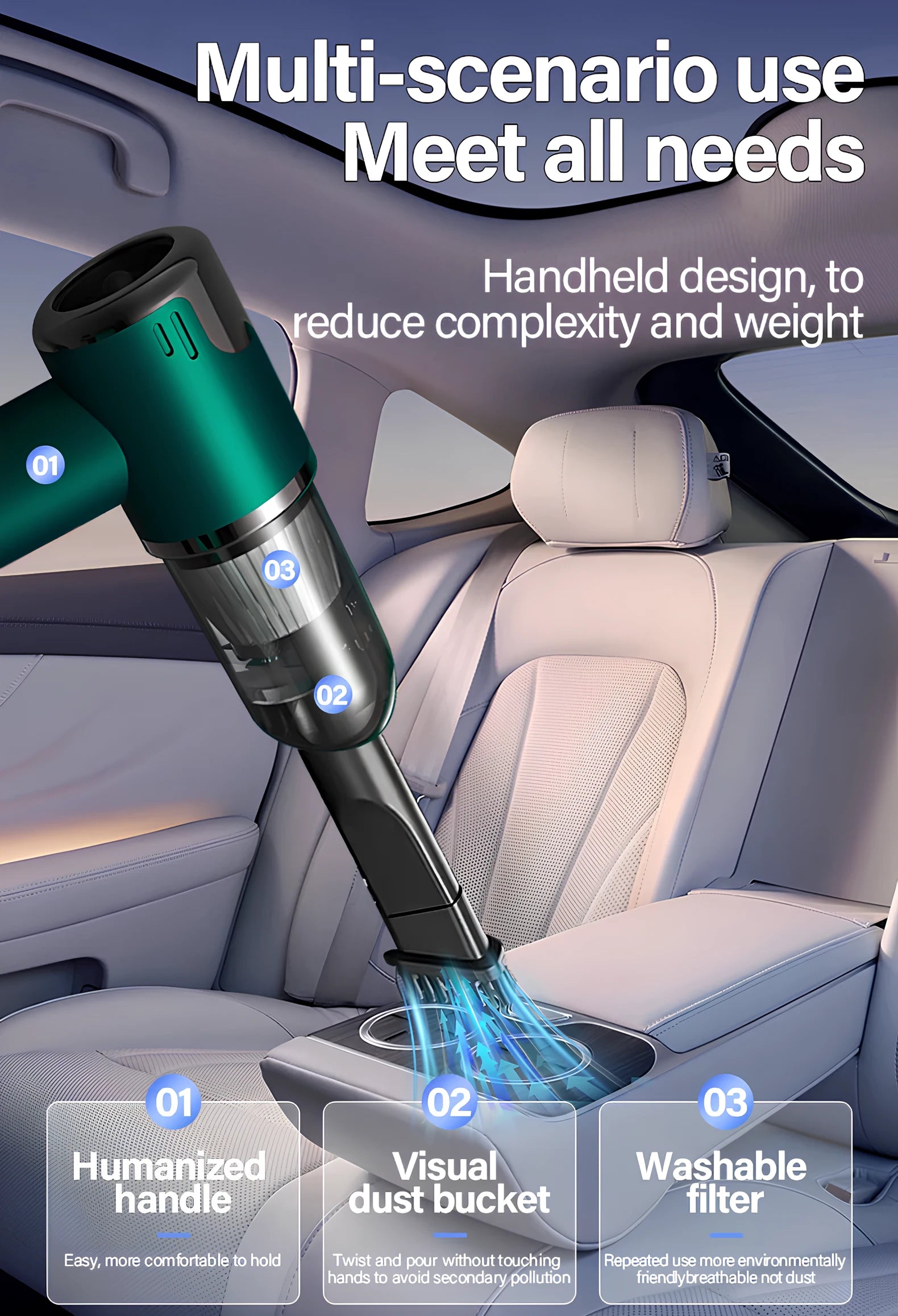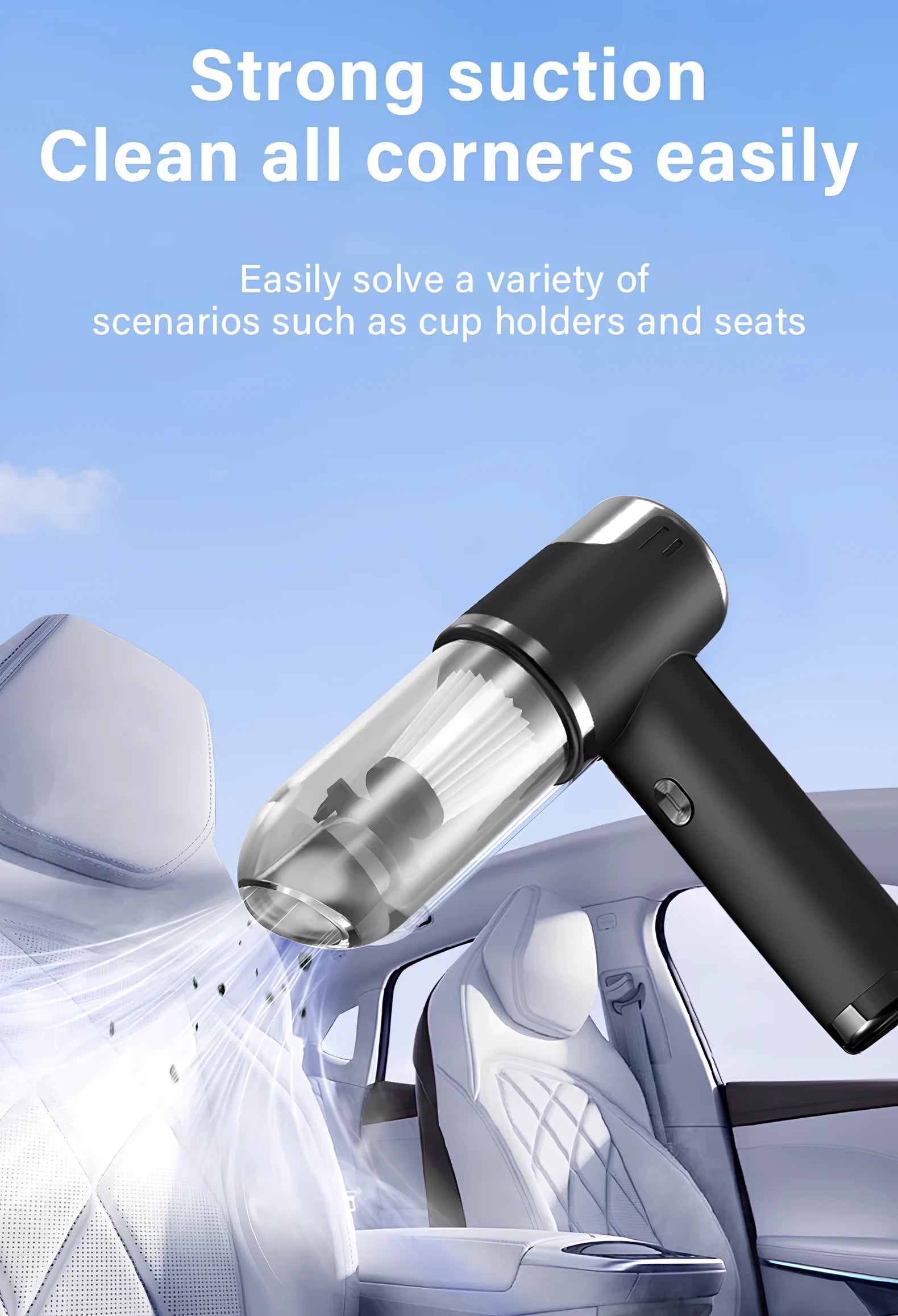 Focused 5 kPa suction designed for fast spot-cleaning in cars and around electronics.
